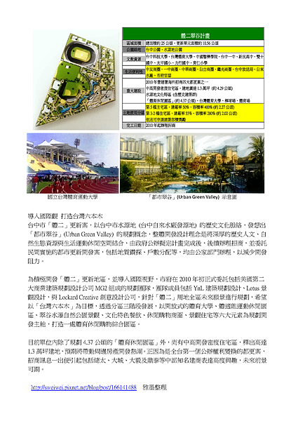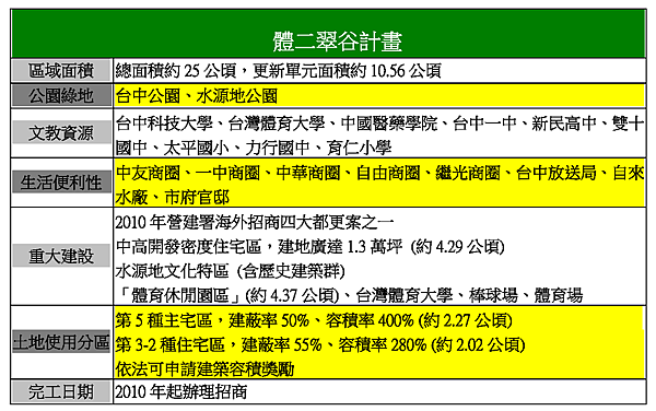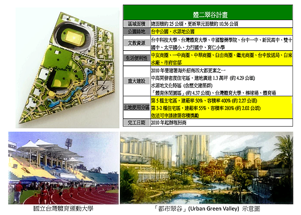 台中市「體二」更新案,以台中市水源地 (台中自來水廠發源地) 的歷史文化脈絡,發想出「都市翠谷」(Urban Green Valley) 的規劃概念,整體開發設計理念是將深厚的歷史人文、自然生態資源與生活運動休閒空間結合,由政府公辦擬定計畫完成後,後續辦理招商,並委託民間實施的都市更新開發案,包括地質鑽探、戶數分配等,均由公家部門辦理,以減少開發阻力。