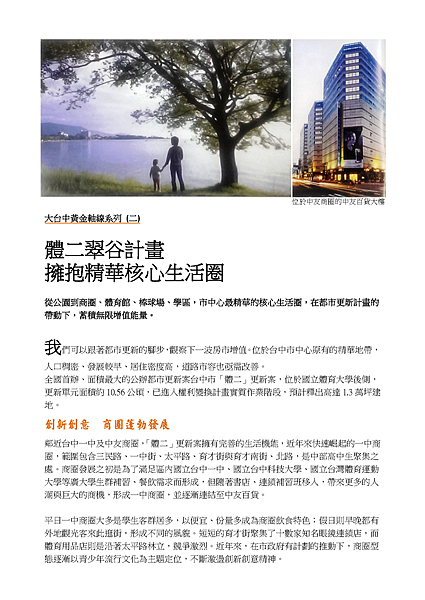 鄰近台中一中及中友商圈,「體二」更新案擁有完善的生活機能,近年來快速崛起的一中商圈,範圍包含三民路、一中街、太平路、育才街與育才南街、北路,是中部高中生聚集之處。商圈發展之初是為了滿足區內國立台中一中、國立台中科技大學、國立台灣體育運動大學等廣大學生群補習、餐飲需求而形成,但隨著書店、連鎖補習班移入,帶來更多的人潮與巨大的商機,形成一中商圈,並逐漸連結至中友百貨。